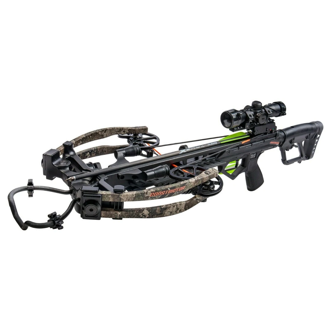 Made for crossbow hunters in tight quarters, the Constrictor CDXβs narrow dimensions and blazing speeds of 410 fps deliver lethal results without draining your wallet. Living up to its name, the Constrictor CDX measures a mere 10β wide cocked and 14β wide uncocked. This ready-to-hunt crossbow package includes 3 Bear X TrueX bolts, illuminated scope, 4-arrow quiver, cocking rope, and rail lube / string wax.
