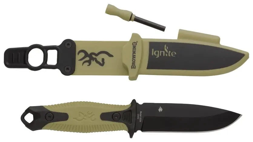 - Rugged polymer belt sheath with polymer handled fire starting flint included
