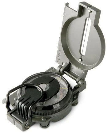 Brunton 9077 in a s classic military-style sighting compass. Heavy-duty construction and a long straight side make for easy use with a map. Liquid dampened with luminous points and a hinge that works with your thumb to stead your sighting, and holds the lid tightly closed.