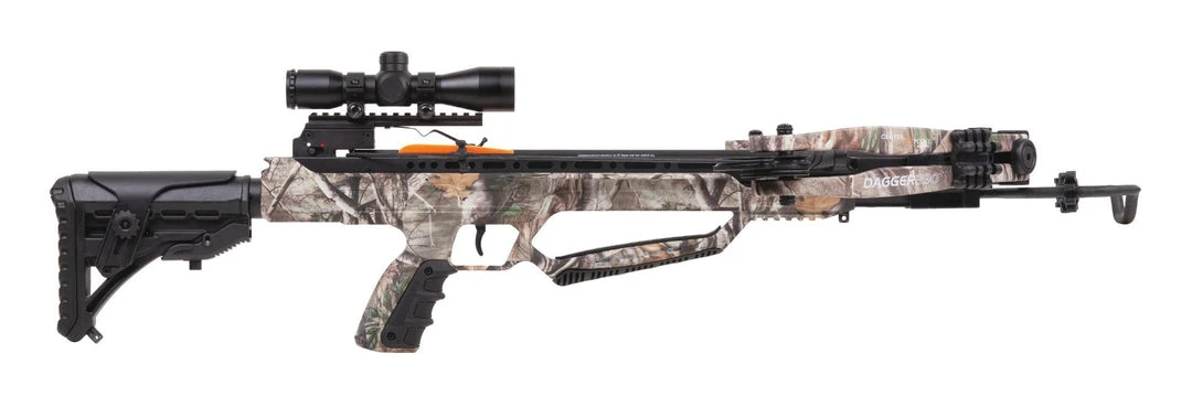 Featuring a CNC-machined aluminum cam system, aluminum rail, anti-dry fire and auto safety, an adjustable stock and 4x32mm scope. CenterPoint Archery offers a 5-year limited warranty. The Dagger 390 is an extremely versatile and powerful crossbow.