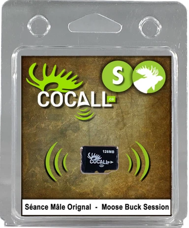 MicroSD card including a moose call session including moose male sounds, breaking branch, horn noises and downtime.