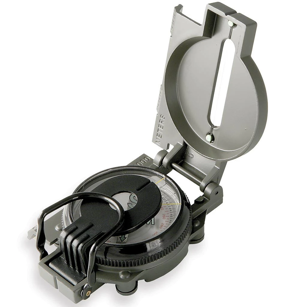 The 9077 in a s classic military-style sighting compass. Heavy-duty construction and a long straight side make for easy use with a map. Liquid dampened with luminous points and a hinge that works with your thumb to stead your sighting, and holds the lid tightly closed.