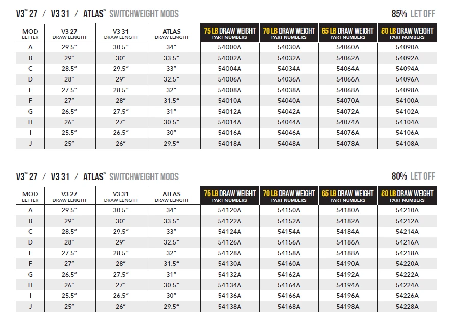 ** If ordering these mods for the V3-31, ADD 1″ to the specified draw length (ie. 60# – 26″ will be an actual 60# – 27″)