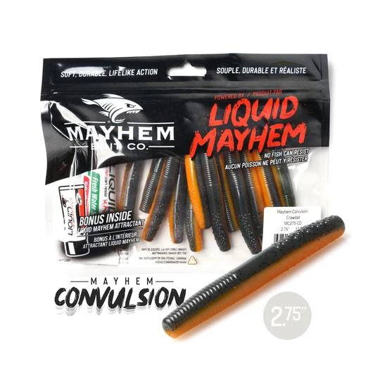 Available in two sizes including our 2.75″ and our 4.00″ offering. Our 2.75″ Mayhem Convulsion is ideal for the increasingly popular Ned Rig while our 4.00″ version is great for Texas Rigging, Drop Shotting, Whacky Worm or Weightless Rigging just to name a few.
