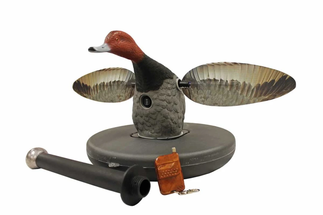 The MOJO® Floater has proved to be one of the most popular of our Line of Spinning Wing Decoys. Offering the significant advantages of not needing a support pole thus allowing the decoy to float and turn and often dance in a super realistic way, and easily deployable in deeper water. Often ducks are more attracted to SWD’s when the wings are close to the water. NOW, MOJO® offers these same advantages in a Floater Decoy in their new, patented Elite Series. Featuring all components in solid housing connected to the easily installed molded float, with the super quiet, flexible body. Elite features result in a faster, quieter, smoother, more user-friendly decoy. Equipped with state-of-the-art remote control. Float conveniently snap locks on/off to the decoy housing with half turn. Operates on 4AA batteries (not included) in a convenient snap-in battery housing. Float designed to receive 11″ threaded stabilizing bar with 14 oz lead weight allowing the decoy to remain stable in much rougher water. Eyelet on float to accept anchor cord. Available in Mallard Drake, Bluebill Drake and Redhead. Another added feature allows float to be removed and battery pack will accept standard MOJO® Support Pole.