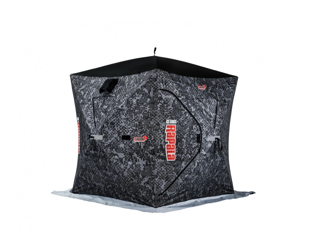 The Sherpa® shelter features a hub-style design for ease of transport and extra interior space. Heavy-duty tubular frame adds to the sturdiness and quick set-up (under 60 seconds). Oversized windows provide light when you need it and can be closed up or completely removed with Velcro® attachment. Large doors for easy access and the dual venting system allows proper exhaust ventilation. The entire unit packs up into a shoulder bag for easy transportation. This spacey shelter is available in 2 & 3 man versions all with the new exclusive Digi-Camo pattern.
