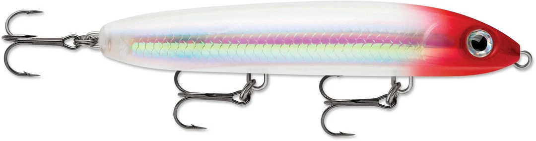 This topwater bait features an exclusive design that radically alters the action of the lure. V-Rap body design combined with tail weighted balance allows the lure to cut quick with the snap of the rod, ending with a soft, long glide on slack line. Translucent Body. 3D Holographic Eyes. Quick Turning Walk-the-Dog. VMC Black Nickel Round Bend Hooks.