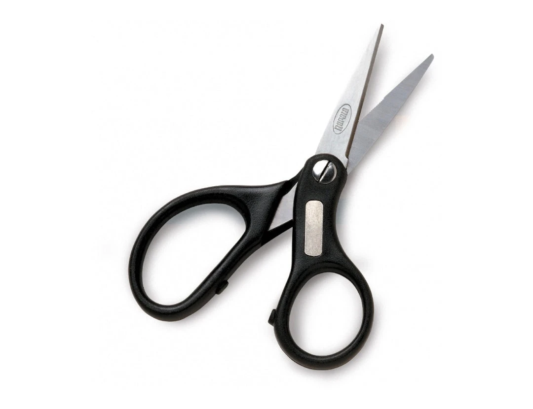Grips braided line for nonslip cutting. Serrated cutting edge. Oversized finger holes. Stainless steel construction.