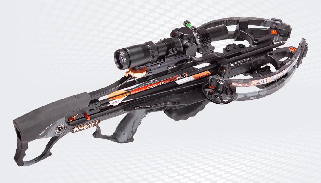 Ravin’s new R29X Sniper Package includes everything you need for top of the line speed and deadly downrange accuracy. The R29X Sniper Package shoots 3-inch groups at 100 yards with 450 FPS and is ideal for those looking for our fastest, top of the line crossbow. The R29X Sniper Package is complete with the new fully integrated Silent Cocking System, HeliCoil Technology and comes with a tactical crossbow scope mounted to a jack plate adjustable elevation mount that you can adjust anywhere between 20 and 200 yards with a simple turn of the dial. Also included as part of the Sniper Package is a scope level and .001 premium arrows for shooting perfection. Available in Predator Dusk Camo, exclusive to Ravin Crossbows.