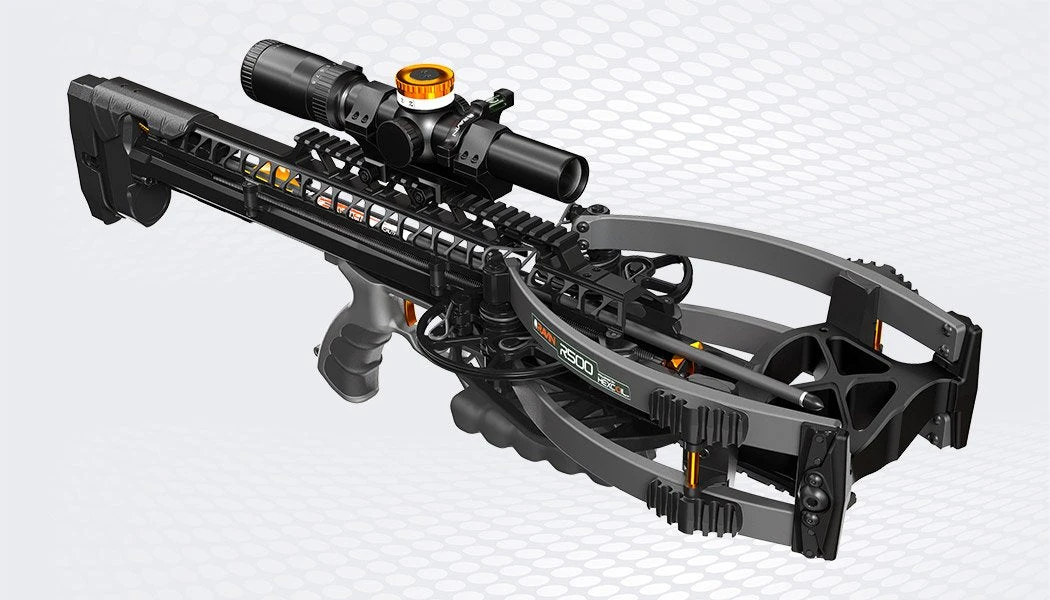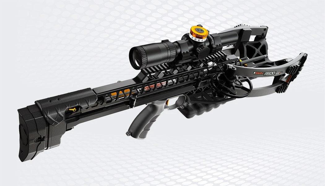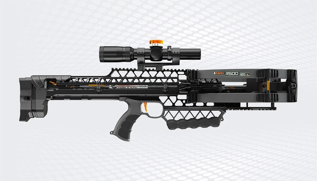 Designed for shooters who want pinpoint accuracy and industry high speeds through a single reticle scope, the R500 Sniper delivers speeds of 500 feet per second and utilizes the new proprietary HexCoil Cam System. The cams rotate 360 degrees and allow the axle-to-axle width fully cocked to be 3.6 inches, and only 28 inches in length! The R500 Sniper utilizes the new VersaDrive Cocking System that has an internal screw drive that moves the Trac Trigger Firing System (TTFS) back and forth. The internal clutch within the VersaDrive System eliminates over-cocking and allows for a cocking and uncocking process that can be stopped or resumed at any time. Complete with the new Adjustable Turret Scope, users will be able to adjust their yardage with a quick turn of the elevation turret. Additional accessories included in the R500 Sniper include The Ravin Scope Level for a perfectly balanced shot as well as .001 Premium Arrows for shooting perfection. The R500 Sniper can be upgraded to the R500E Sniper with purchase of the Electric Drive Kit, sold separately. The R500 Sniper comes in Slate Gray and will be available Spring 2021.