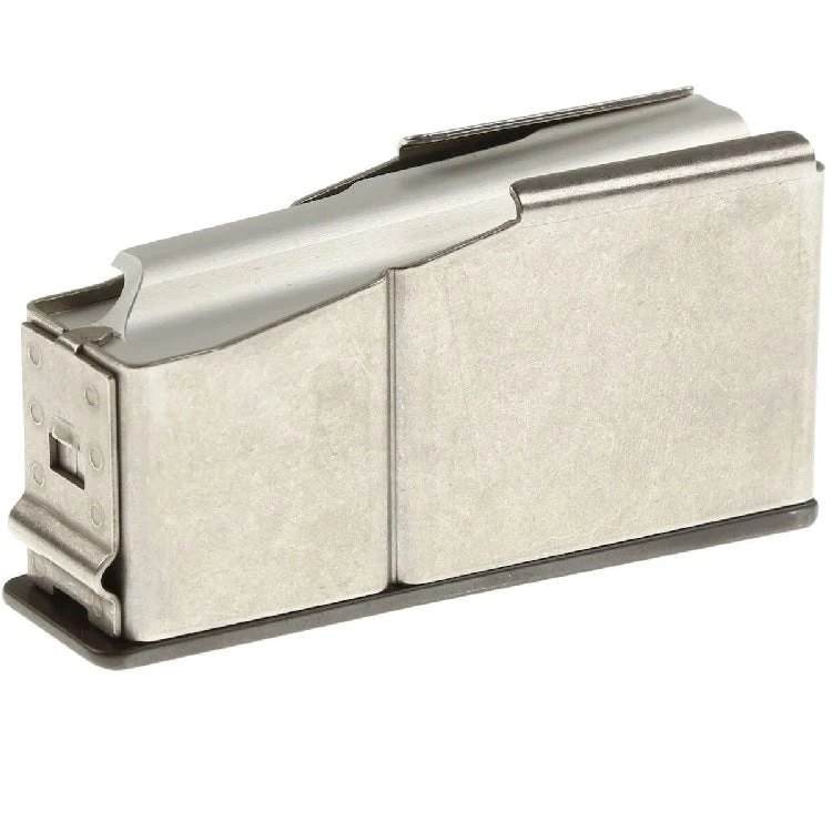 The staggered, two-row magazine of the Sako 85 is made of stainless steel. The detachable magazine can also be loaded through the ejection port. The Total Control Latch (patent pending) of the Sako 85 prevents accidental magazine release            Finish / Color: Blued Bottom/Stainless sides.