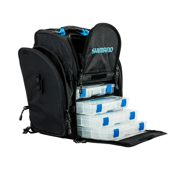 The Shimano Blackmoon Backpack (Front Load) anglers to access four 3600-size tackle trays from the front drop-down flap for easy access to tackle. Secured for transport with side zippers, this drop-down compartment can be secured with just the velcro fastener for quick access to the tackle trays. The additional storage above the trays is a perfect spot for reels, tools or personal belongings, while the side pockets are ideal for quick access to leader material and pliers.Â