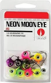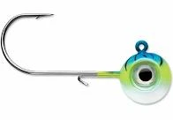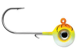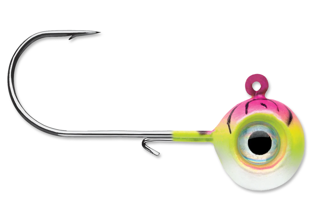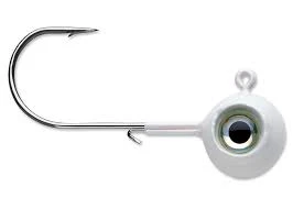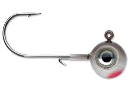 This VMC upgraded version of the traditional Aspirin-shaped heads provides added control. 3-D holographic eyes create the illusion of a wider profile while adding realism. Assembled with a VMC Premium high-carbon steel hook with top of the line black nickel finish. The wide range of colors includes UV Bright finish colors that guarantee you to catch more fish in all water conditions.